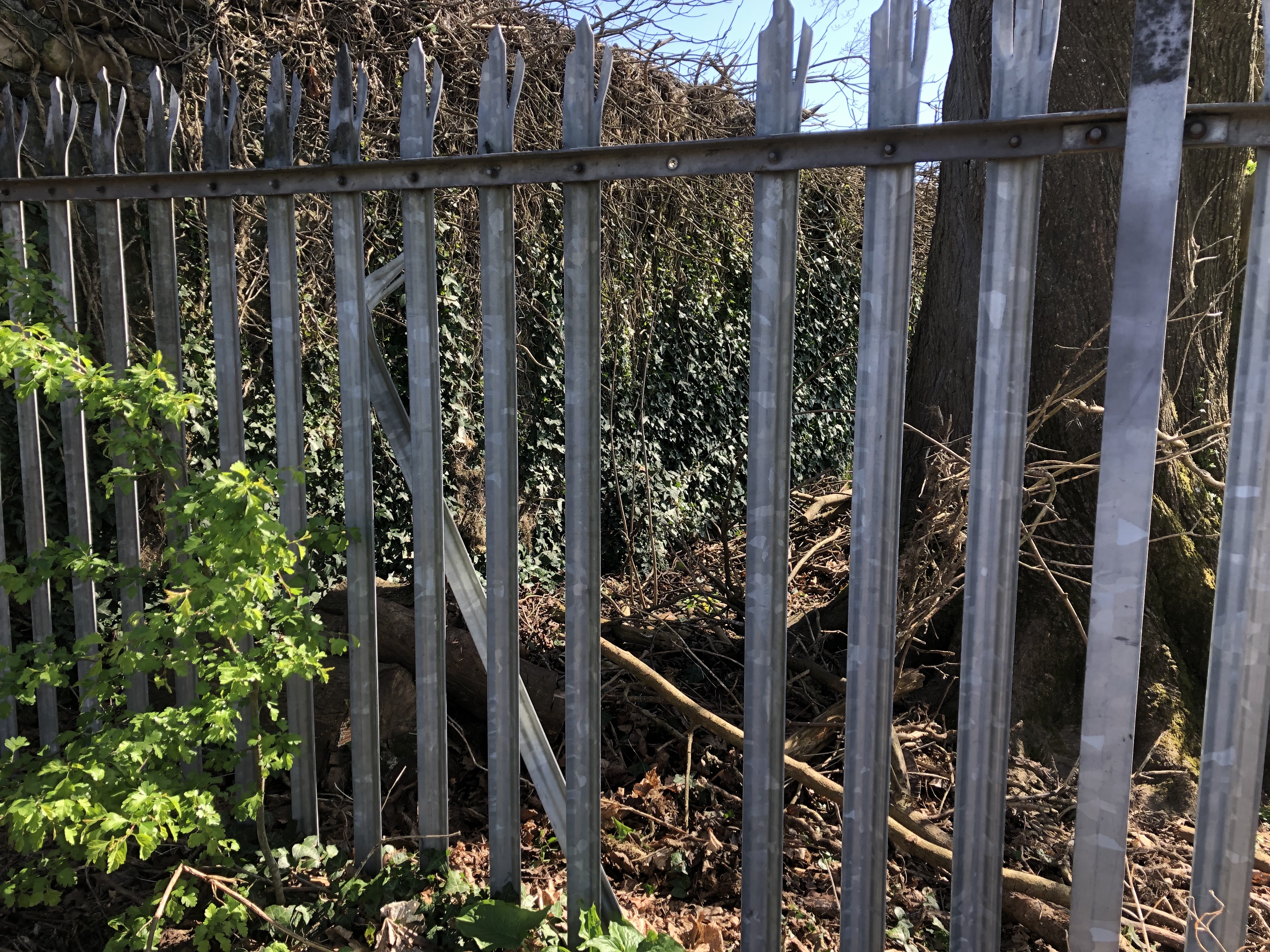 Intruders – and it must have taken some work – succeeded in detaching one of the security fence palings at the top, so that it could be displaced as shown. It’s now been repaired, and the top of the fence garnished with climbing rose prunings. It was the fence adjoining Llandaff Fields Park, near where it meets the listed old wall.