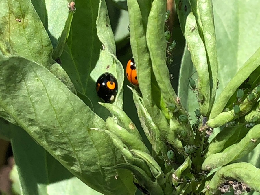 However, a few days ago we noticed that they seemed to be recovering, making sturdy new growth with healthy flowers. On closer inspection we found that they were now populated by ladybirds, making a feast of the blackfly, and leaving relatively few behind. There were quite a few ladybird larvae too, always a good thing to see.