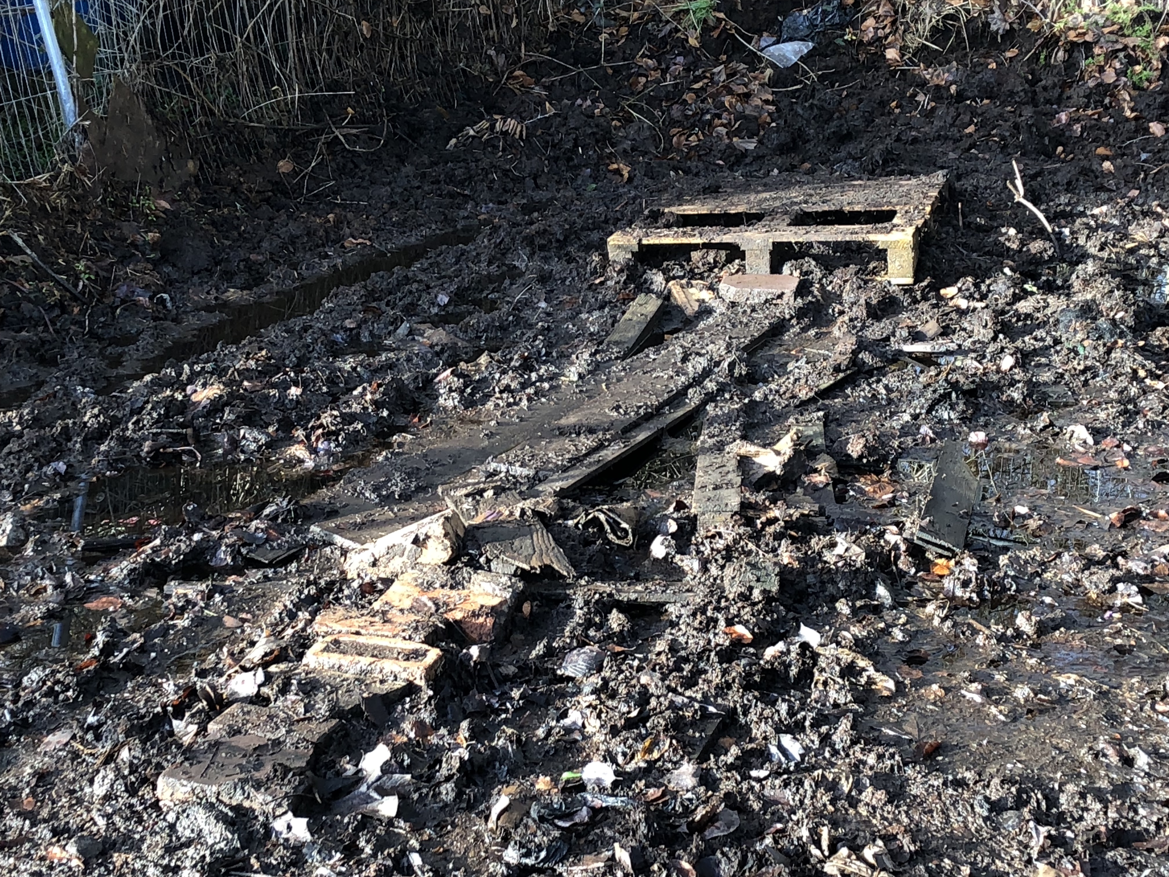 Someone has improvised a causeway out of waste materials to enable access across the large puddle and the mud to the residual manure, which has now all been used.